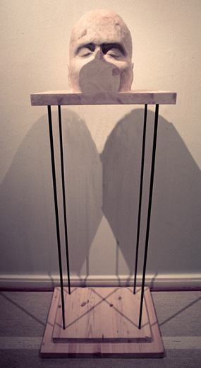 "Häpeä" 2001 (Osa kokonaisuutta "Kaikki virtaa") (mänty, vernissa, pigmentti, vaha, rauta) koko: 145cm x 45cm x 45cm