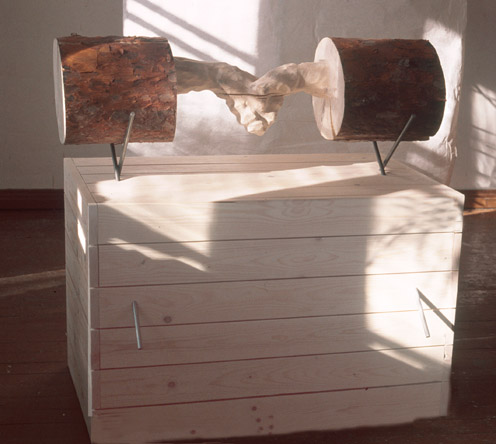 "Pojat" 2003 (mänty, pigmentti, vernissa, teräs) Koko: 90cm x 80cm x 60cm